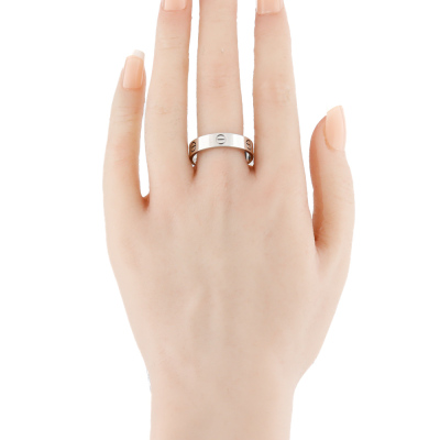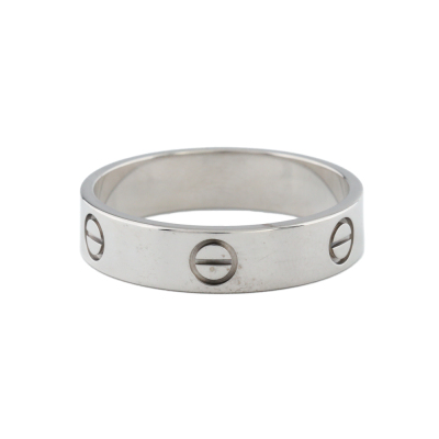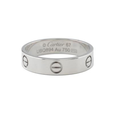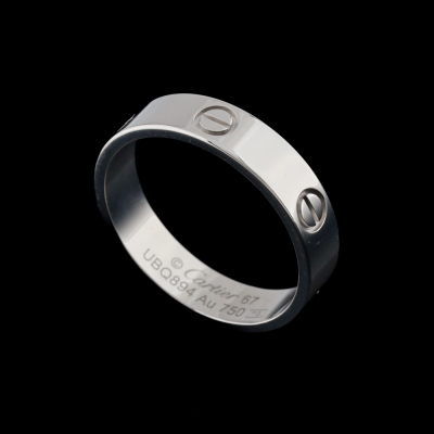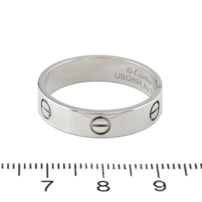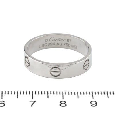 Cartier Love ring, classic model. 18ct white gold. Cartier stamped size 67, measures as Australian size: X - ring resizing is not is not recommended. Band width: 5.5mm. Weight: 7.9g. With Cartier inner box, outer box & bag. Cartier certificate dated: 30/04/23 & Cartier exchange size receipt same date. (Pre-owned)