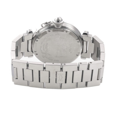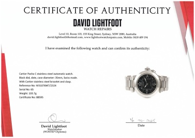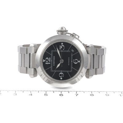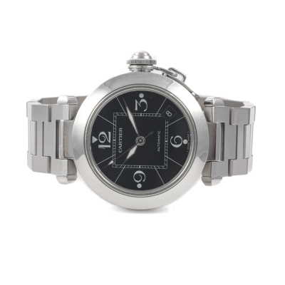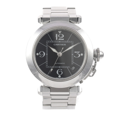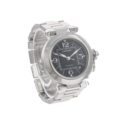 Cartier Pasha C stainless steel automatic watch. Black dial, date, case diameter: 35mm, wrist size: 15.5cm, Swiss made. Ref# W31076M7/2324. With Cartier stainless steel bracelet and clasp. With Certificate of Authenticity. 3 month FSA warranty. (Pre-owned)