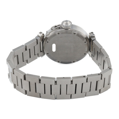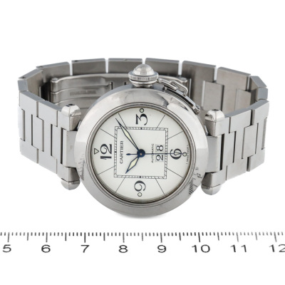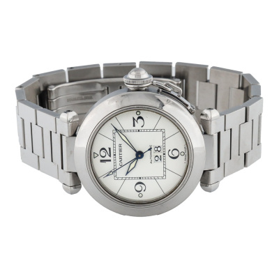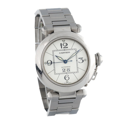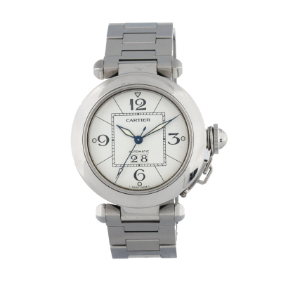 Cartier Pasha C stainless steel automatic watch. White dial, date, case diameter: 35mm, wrist size: 18cm, Swiss made. Ref# W31055M7/2475. With Cartier stainless steel bracelet and clasp. With Certificate of Authenticity. 3 month FSA warranty (Pre-owned)