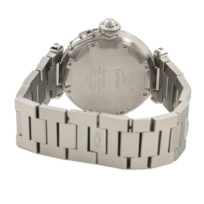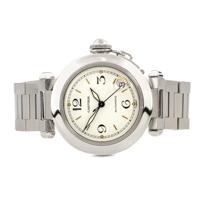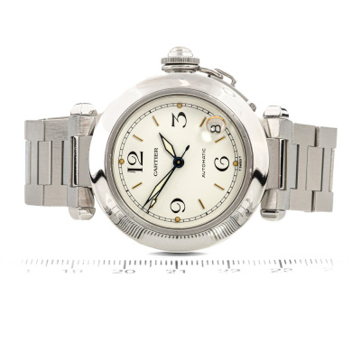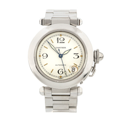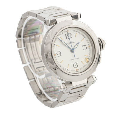 Cartier Pasha C stainless steel automatic watch. Ivory Colour dial, date, case diameter: 35mm, wrist size: 16.5cm, Swiss made. Ref# W31015M7/2324. With Cartier stainless steel bracelet and clasp. With Certificate of Authenticity. 3 month FSA warranty. (Pre-owned)