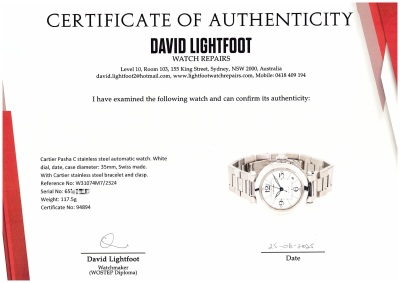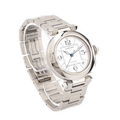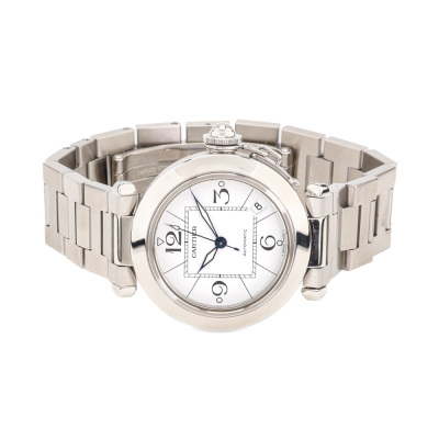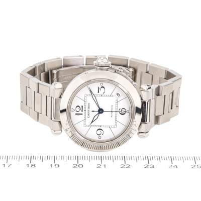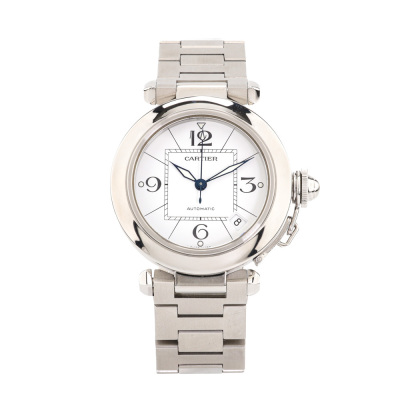 Cartier Pasha C stainless steel automatic watch. White dial, date, case diameter: 35mm, max wrist size: 18.5cm, Swiss made. Ref# W31074M7/2324. With Cartier stainless steel bracelet and clasp. With Certificate of Authenticity and Cartier Certificate Booklet dated 09/08/2014. 3 month FSA warranty. (Pre-owned)