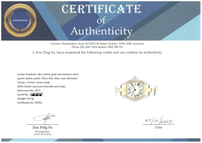 Cartier Roadster 18ct yellow gold and stainless steel quartz ladies watch. Silver dial, date, case diameter: 31mm x 37mm, wrist size: 15cm, Swiss made. Ref# 2675. With Cartier two-tone bracelet and clasp. With Certificate of Authenticity, Cartier Guarantee Certificate booklet dated 12/03/2014 and Cartier box. 3 month FSA warranty. Weight: 94.4g. (Pre-owned)