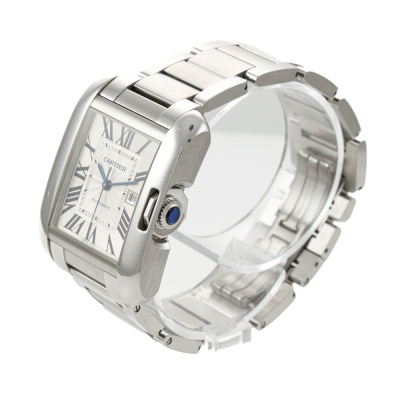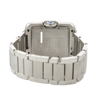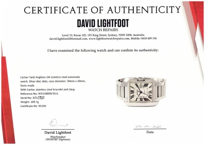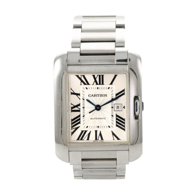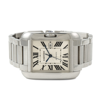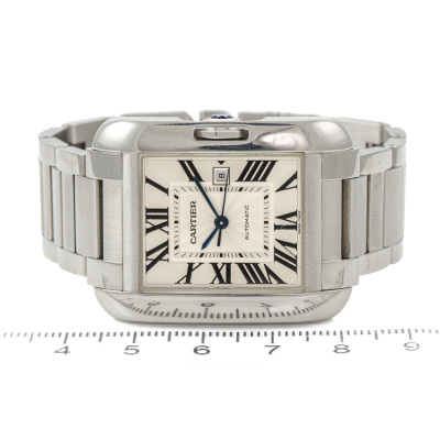 Cartier Tank Anglaise LM stainless steel automatic watch. Silver dial, date, case diameter: 39mm x 30mm, wrist size: 16cm, Swiss made. Ref# W5310009/3511. With Cartier stainless steel bracelet and clasp. With Certificate of Authenticity. 3 month FSA warranty. (Pre-owned)