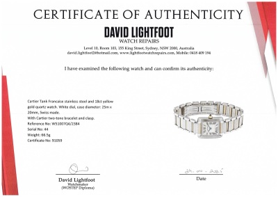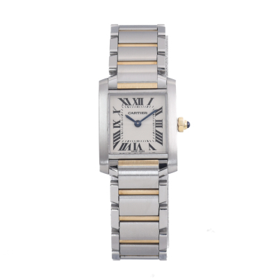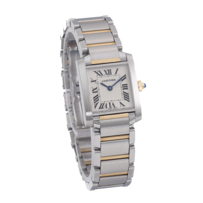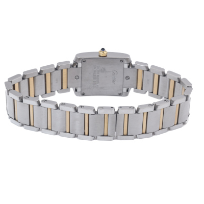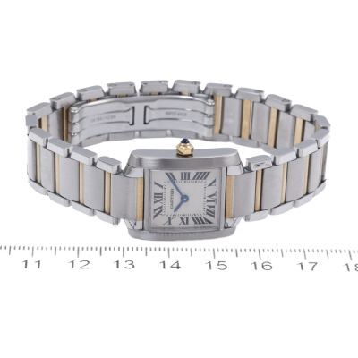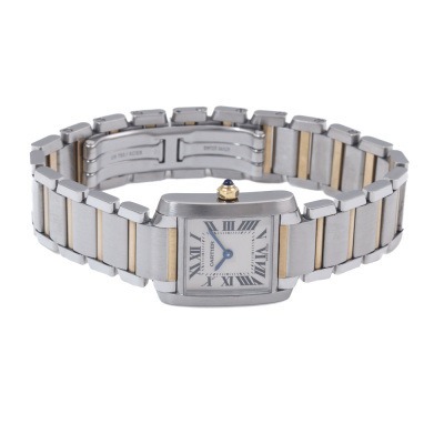 Cartier Tank Francaise stainless steel and 18ct yellow gold quartz ladies watch. White dial, case diameter: 25m x 20mm, wrist size: 16.5cm, Swiss made. Ref #W51007Q4/2384. With Cartier two-tone bracelet and clasp. With Certificate of Authenticity and Cartier box. 3 month FSA warranty.(Pre-owned)