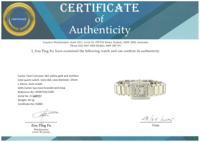 Cartier Tank Francaise 18ct yellow gold and stainless steel quartz ladies watch. Ivory dial, case diameter: 25mm x 20mm, wrist size: 16cm, Swiss made. Ref# W51007Q4/2300. With Cartier two-tone bracelet and clasp. With Certificate of Authenticity. 3 months FSA warranty (Pre-owned)