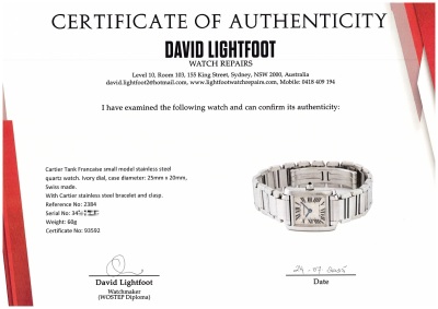 Cartier Tank Francaise small model stainless steel quartz ladies watch. Ivory dial, case diameter: 25mm x 20mm, wrist size: 16cm, Swiss made. Ref# 2384. With Cartier stainless steel bracelet and clasp. With Certificate of Authenticity. 3 month FSA warranty. Weight: 60g (Pre-owned)