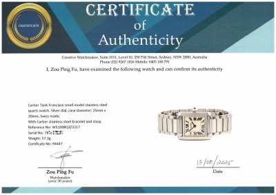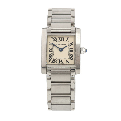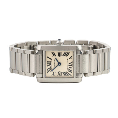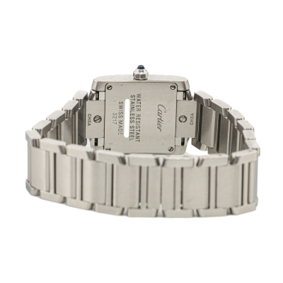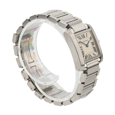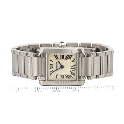 Cartier Tank Francaise small model stainless steel quartz ladies watch. Silver dial, case diameter: 25mm x 20mm, wrist size: 15cm, Swiss made. Ref# W51008Q3/3217. With Cartier stainless steel bracelet and clasp. With Certificate of Authenticity. 3 month FSA warranty. Weight: 57.3g (Pre-owned)
