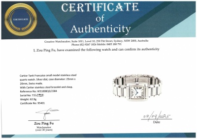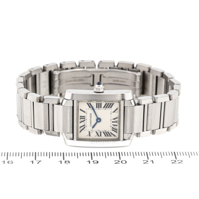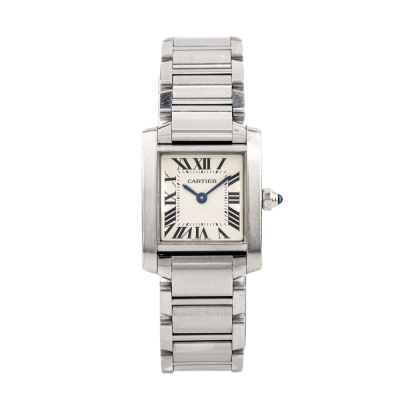 Cartier Tank Francaise small model stainless steel quartz ladies watch. Silver dial, case diameter: 25mm x 20mm, wrist size: 16.5cm, Swiss made. Ref# W51008Q3/2384. With Cartier stainless steel bracelet and clasp. With Certificate of Authenticity, Cartier Certificate and Guarantee booklet dated 14/01/2012 and Cartier box. 3 month FSA warranty (Pre-owned)