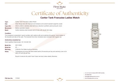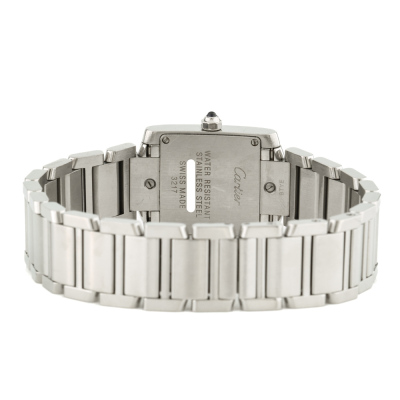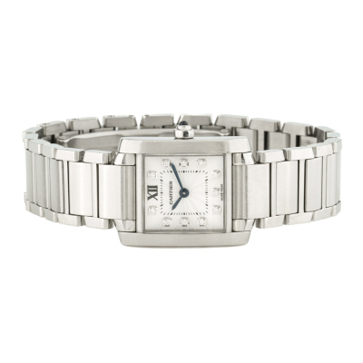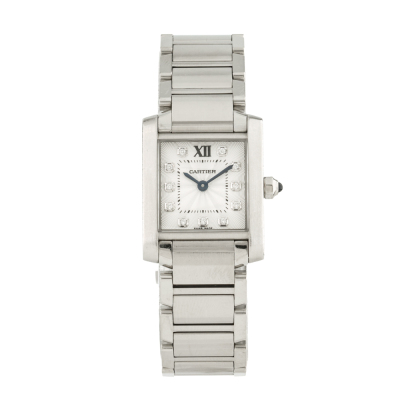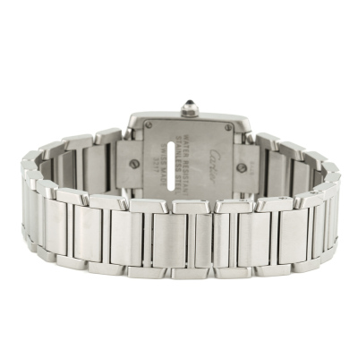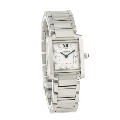 Cartier Tank Francaise Small stainless steel quartz ladies watch. Silver dial, Diamond indicators, case diameter: 25mm x 20mm, wrist size: 16.5cm, Swiss made. Ref# WE110006/3217. With Cartier stainless steel bracelet and clasp. With Certificate of Authenticity. 3 month FSA warranty. Weight: 62.6g.