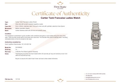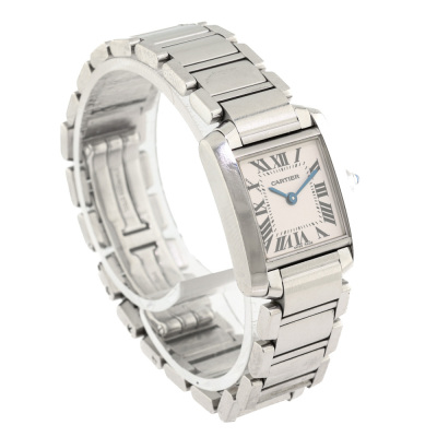 Cartier Tank Francaise small model stainless steel quartz ladies watch. Silver dial, case diameter: 25mm x 20mm, wrist size: 16cm, Swiss made. Ref# W51008Q3/2384. With Cartier stainless steel bracelet and clasp. With Certificate of Authenticity and Cartier box. 3 month FSA warranty. Weight: 59.9g
