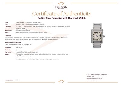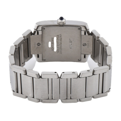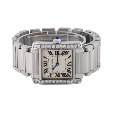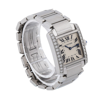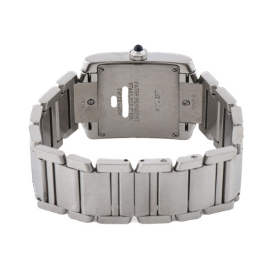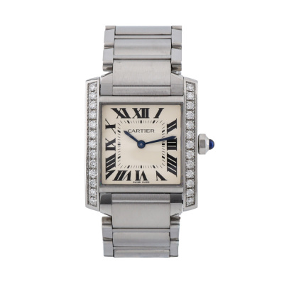 Cartier Tank Francaise stainless steel quartz ladies watch. Silver dial, Diamond on bezel, case diameter: 32.0mm x 27.0mm, wrist size: 14cm, Swiss made. Ref# W4TA0009/3751. With Cartier stainless steel bracelet and clasp. With Certificate of Authenticity. 3 month FSA warranty. Weight: 73.9g.