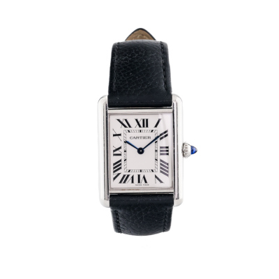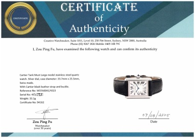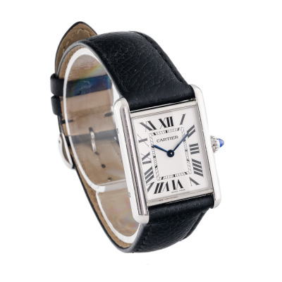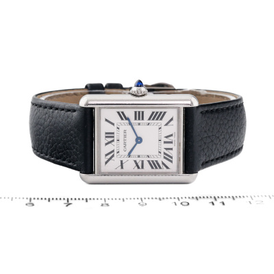 Cartier Tank Must Large model stainless steel quartz ladies watch. Silver dial, case diameter: 33.7mm x 25.5mm, max wrist size: 19cm, Swiss made. Ref# WSTA0041/4323. With Cartier black leather strap and buckle. With Certificate of Authenticity. 3 month FSA warranty. (Pre-owned)