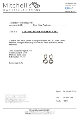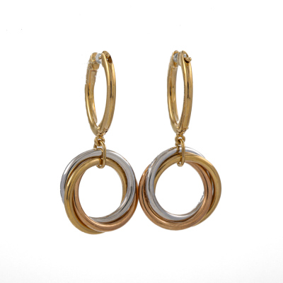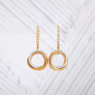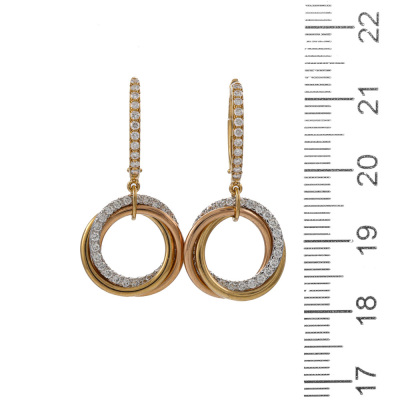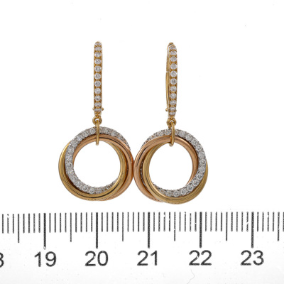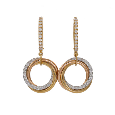 Cartier Trinity earrings with 72 round Natural Diamonds totalling 0.55ct (Estimated grading: F-G VS). 18ct yellow, white, rose gold. Drop length: 3.0cm. Motif outer diameter: 14.8mm. With Certificate #422825.