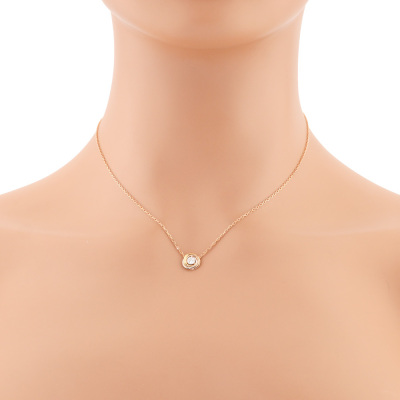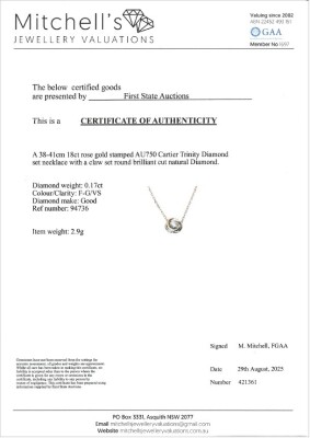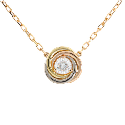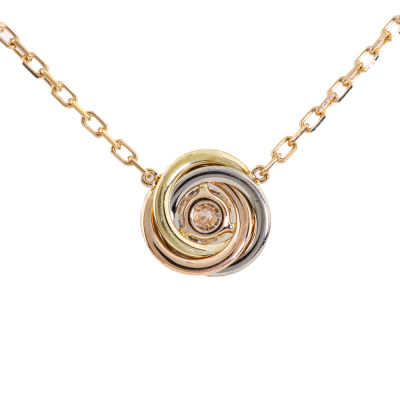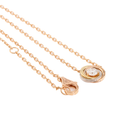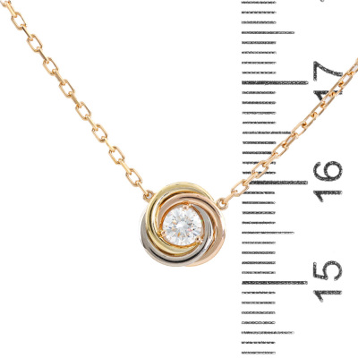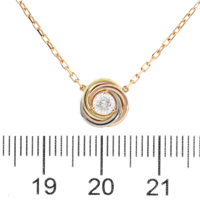 Cartier Trinity Necklace with one round Natural Diamond of approximately 0.17ct. Motif diameter: 8.7mm. 18ct yellow, white & rose gold with Cartier 18ct rose gold attached chain. Length: 38cm - 41cm. Weight: 2.9g. With Certificate #421361. (Pre-owned)