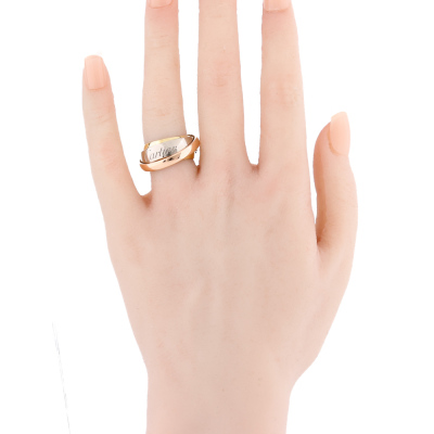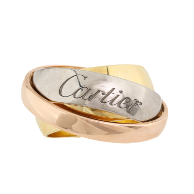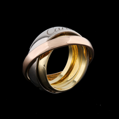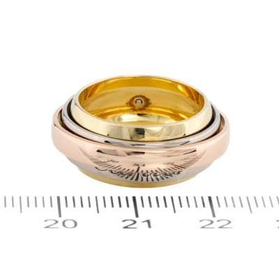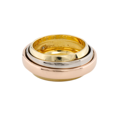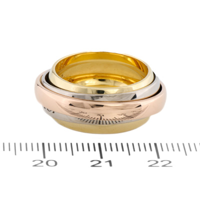 Cartier Trinity Mast Essence ring. 18ct white, rose and yellow gold. Cartier stamped size 52, measures as Australian size: L 3/4- ring resizing is not recommended. Width: 9mm - 5.8mm - 3.4mm. Weight: 14.9g. (Pre-owned)