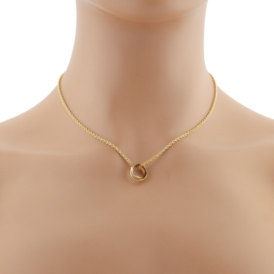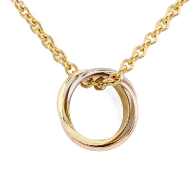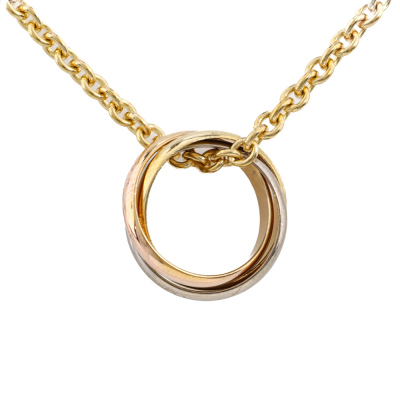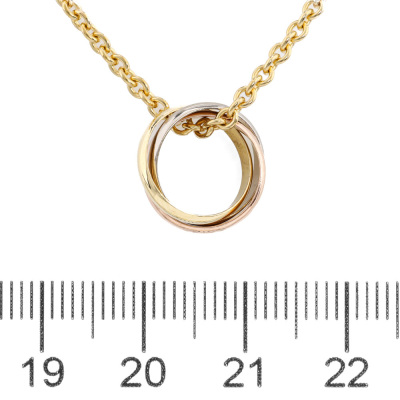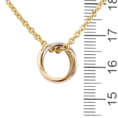 Cartier Trinity Necklace. Motif diameter: approximately 12mm. 18ct yellow, rose & white gold with 42.5cm Cartier 18ct yellow gold chain and non Cartier safety chain. Circa 1997. Weight: 8.9g. (Pre-owned)