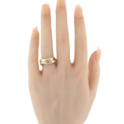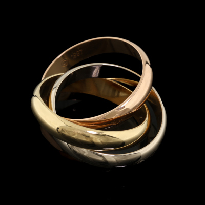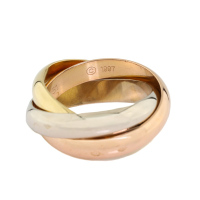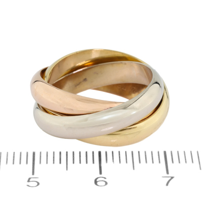Cartier Trinity Ring, Classic Model. 18ct yellow, rose & white gold. Cartier stamped size 51, measures as Australian size: H. 3 bands, individual band width: 4mm. Weight: 11.2g.