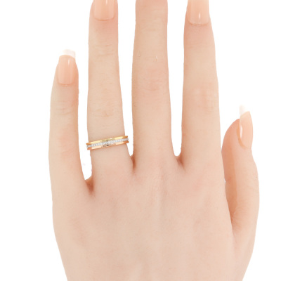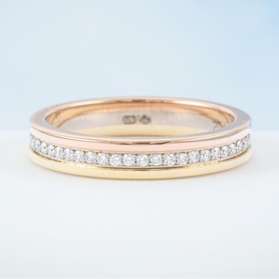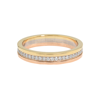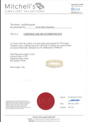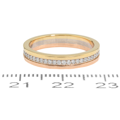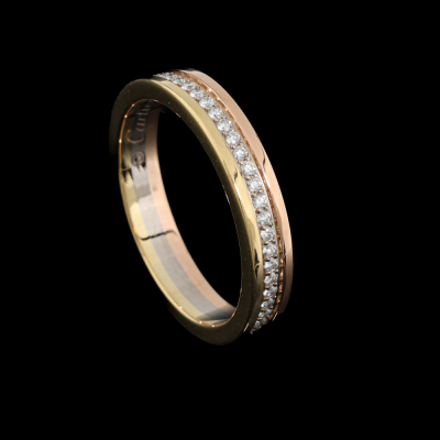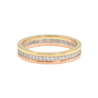 Cartier Vendome Louis Wedding ring with full loop round Diamonds totalling approximately 0.23ct. 18ct yellow, rose and white gold. Cartier stamped size 50, measures as Australian size: J 3/4 - ring resizing is not recommended. Width of band: 3.5mm. Weight: 3.8g. With Certificate #421128. (Pre-owned)