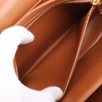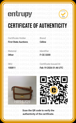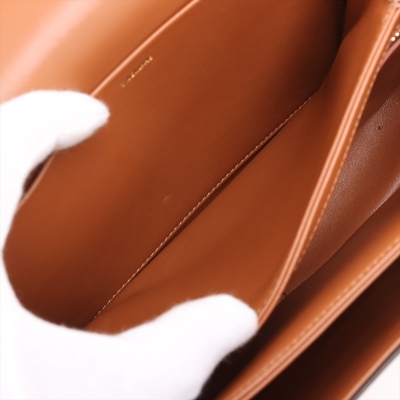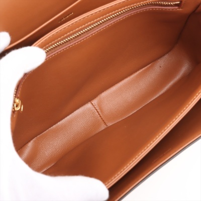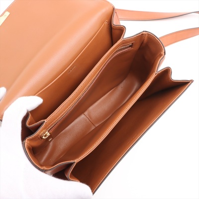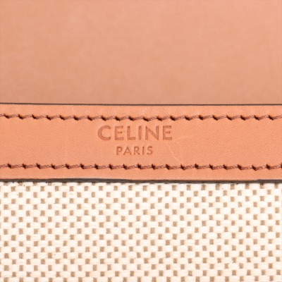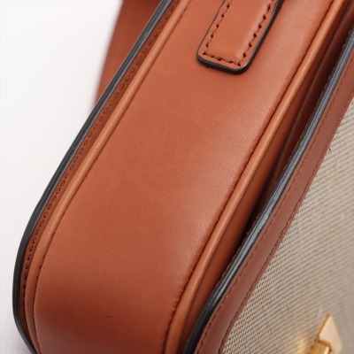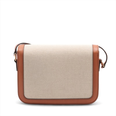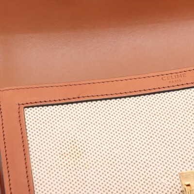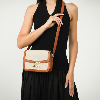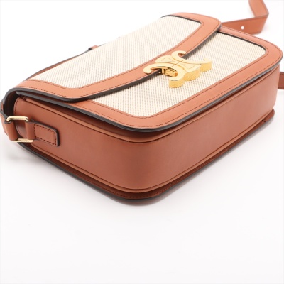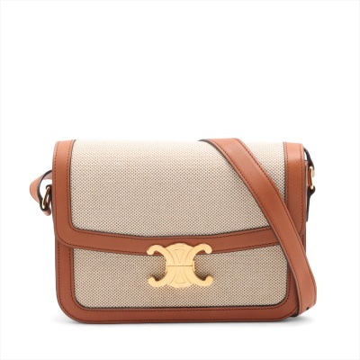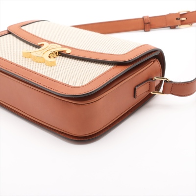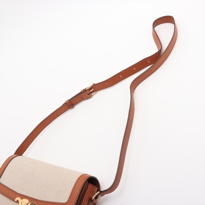 Celine classic Triomphe bag in beige textile and brown smooth calfskin leather (circa: 2020). Featuring gold-toned hardware, lambskin lining, and an adjustable strap. The iconic Celine Triomphe press-lock clasp opens to a partitioned brown leather interior with zippered and patch pockets. Approximate dimensions: 22cm(W) x 15.5cm(H) x 6cm(D), with a 49cm shoulder drop, adjustable. Accompanied by a Celine dustbag. With Entrupy Certificate of Authenticity.