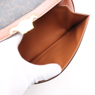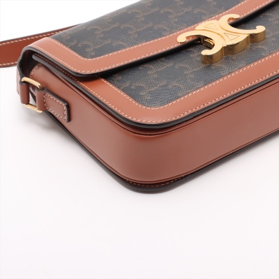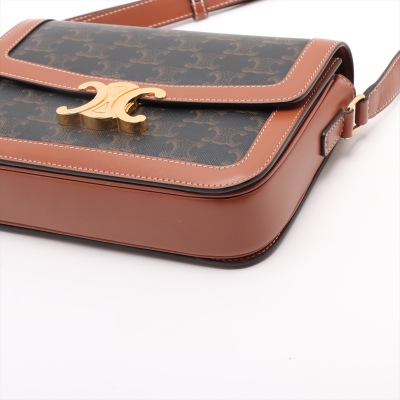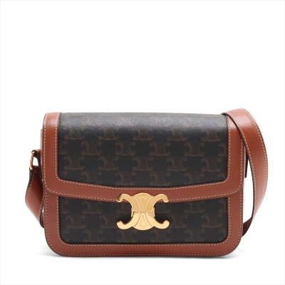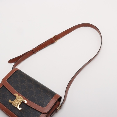Celine classic Triomphe bag in Triomphe canvas and brown smooth calfskin leather. Featuring gold-toned hardware, adjustable leather shoulder strap and a front flap with signature Celine logo. The push-lock closure opens to a partitioned brown leather interior with a front pocket and a zippered pocket. Approximate dimensions: 22cm(W) x 16cm(H) x 6cm(D), and 49cm adjustable strap drop. With Entrupy Certificate of Authenticity.