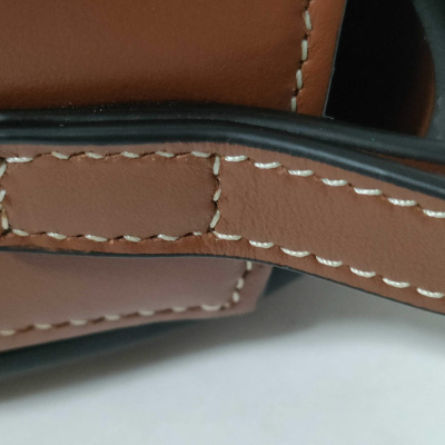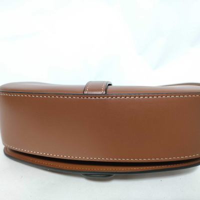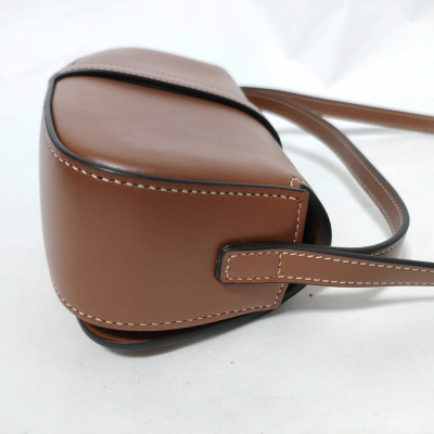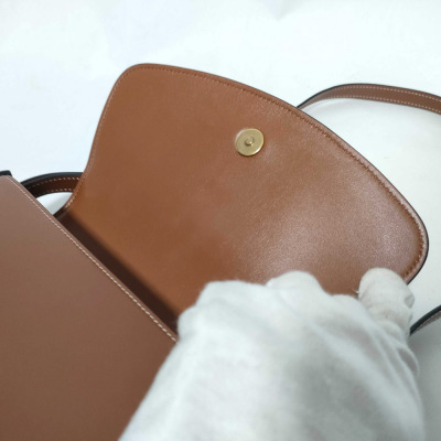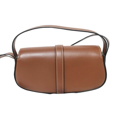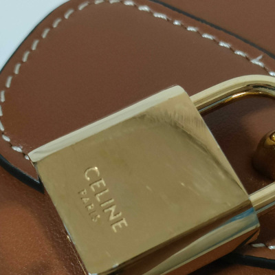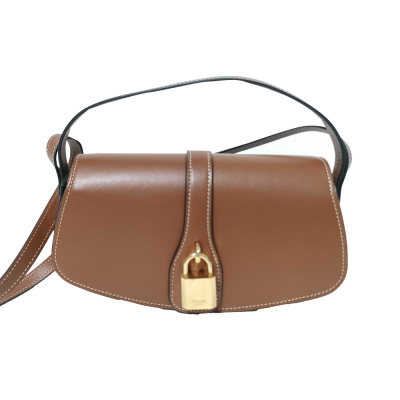 Celine clutch on strap Tabou in smooth brown calfskin. Featuring gold-tone hardware, top leather handle & adjustable shoulder strap making bag can be shoulder and hand carry. The front flap with decorative padlock & magnetic snap button closure opens to a brown leather interior with a patch pocket. Approximate dimensions: 19cm(W) × 9.5cm(H) × 5.5cm(D), 7.5cm handle drop, 28.5cm shoulder drop. With Entrupy Certificate of Authenticity. (Pre-owned)