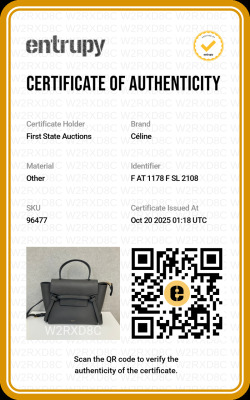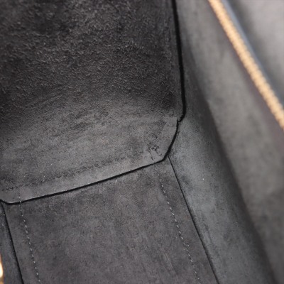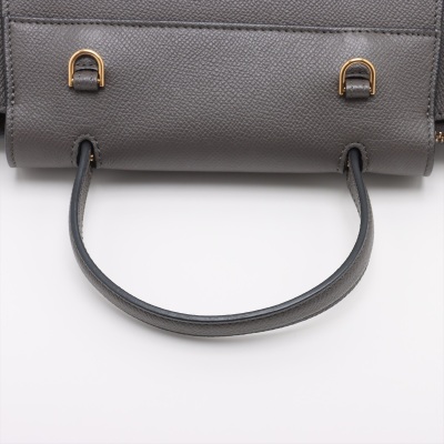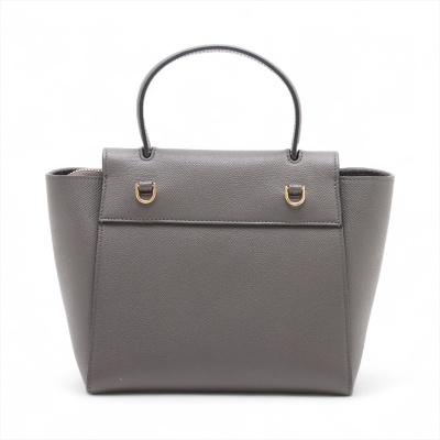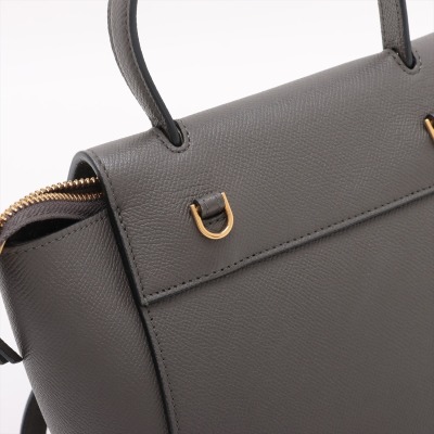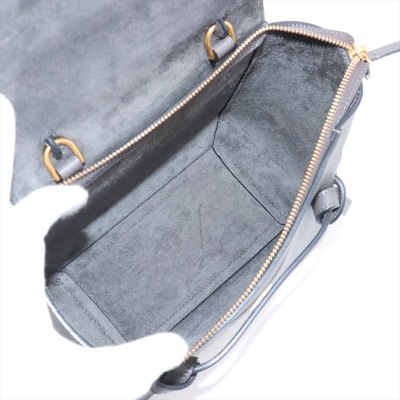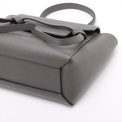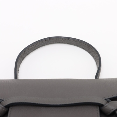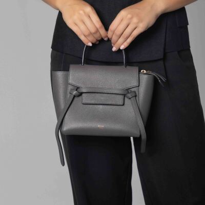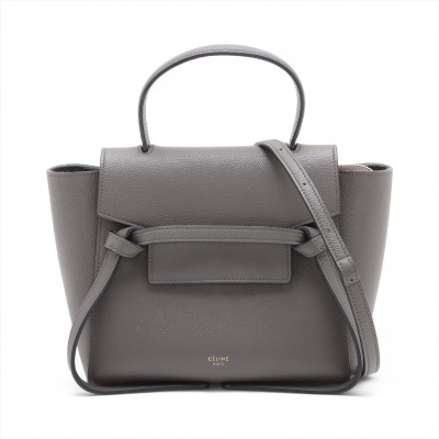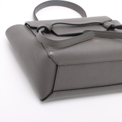 Celine nano belt bag in grey grained calfskin leather. Featuring gold-toned hardware, single top flat leather handle, front belt details, CELINE logo printed at front. The flap with magnetic button and top zipper closures open to a colour matching suede interior. Approximate dimensions: 20cm(Base-L) x 18cm(H) x 11cm(D), handle drop 8cm, detachable strap drop 58cm, adjustable. Accompanied by Celine dustbag. With Entrupy Certificate of Authenticity. (Pre-owned)