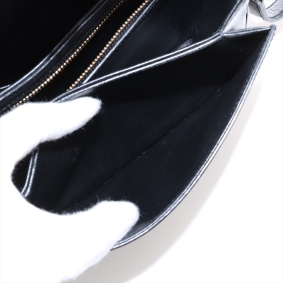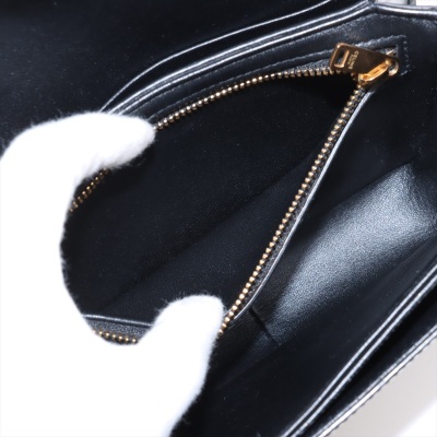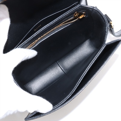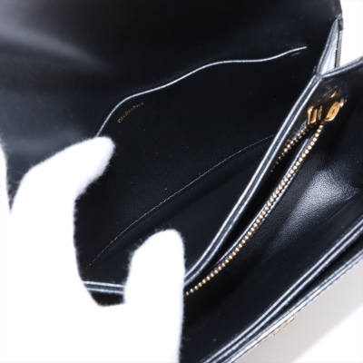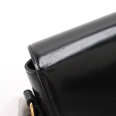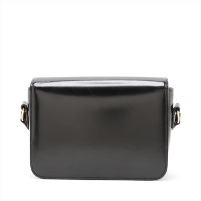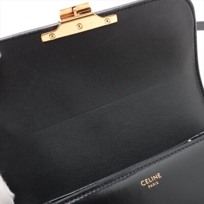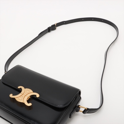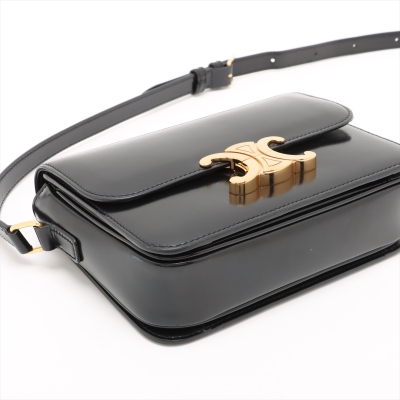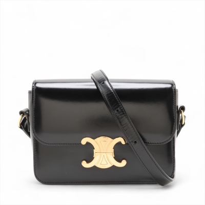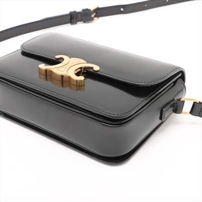 Celine Teen Triomphe bag in black shiny calfskin leather. Featuring gold-toned hardware, a leather shoulder strap and a front flap with signature Celine logo. The push-lock closure opens to a partitioned black leather interior with a front pocket, a main compartment and a back pocket with a patch pocket. Approximate dimensions: 19cm(W) x 14cm(H) x 6cm(D), and 51cm adjustable shoulder drop. Accompanied by a Celine care card. With Entrupy Certificate of Authenticity.