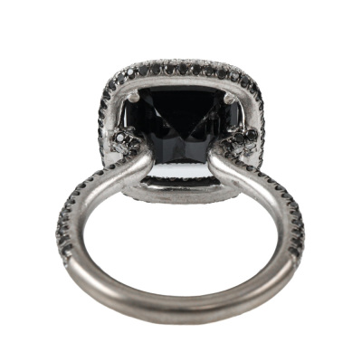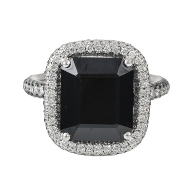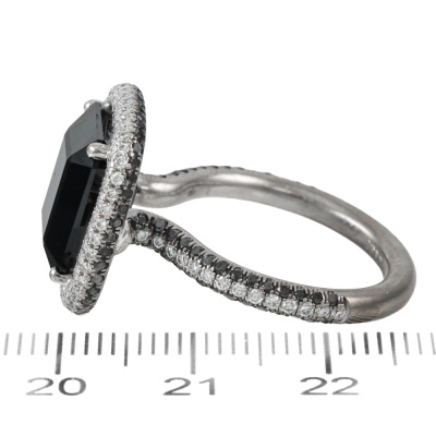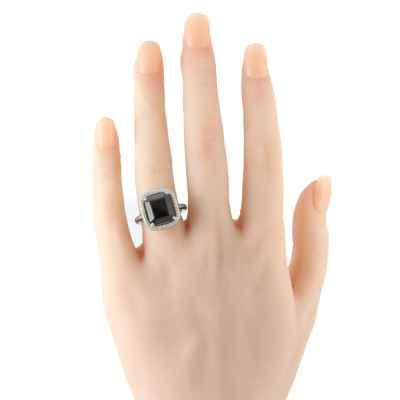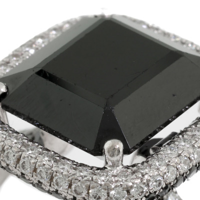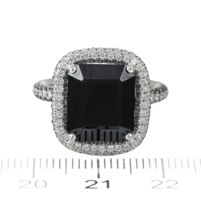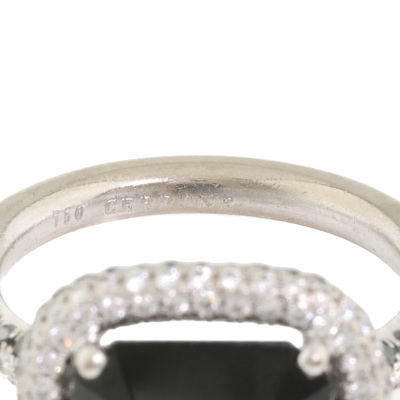 Cerrone Onyx and Diamond halo ring with centre emerald cut Natural Onyx of size 12.5 x 10.5mm and remaining round Natural White and Black Diamonds totalling approximately 1.00ct (Estimated grading for white Diamond: G VS). 18ct white gold. Ring size M1/2. Band width: 2.5mm. Weight: 9.3g.