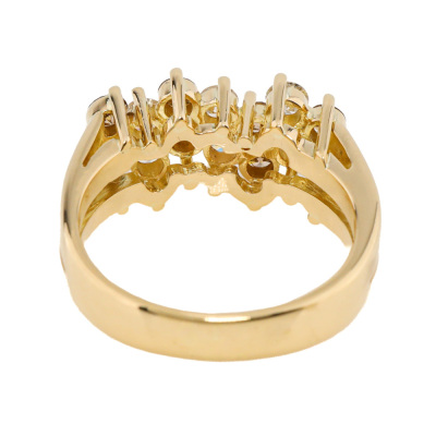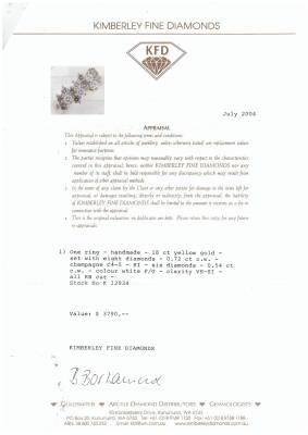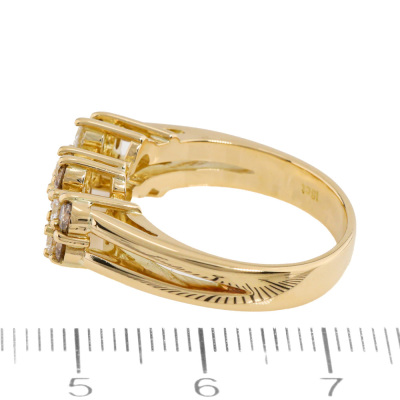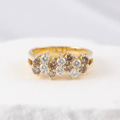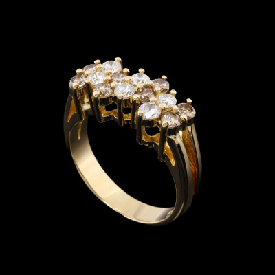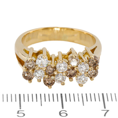 Diamond ring with 14 round Champagne & White Natural Diamonds totalling 1.26ct (Estimated grading: C4-C5 & F-G VS-SI). 18ct yellow gold. Ring size Q. Band width: 3.8mm-4.3mm. Weight: 8.4g. With Kimberley Fine Diamonds Invoice & Appraisal dated 07/04.