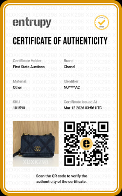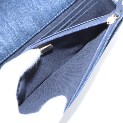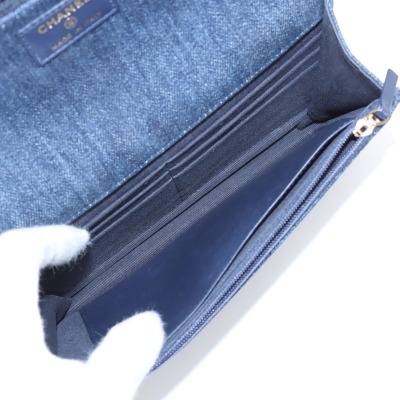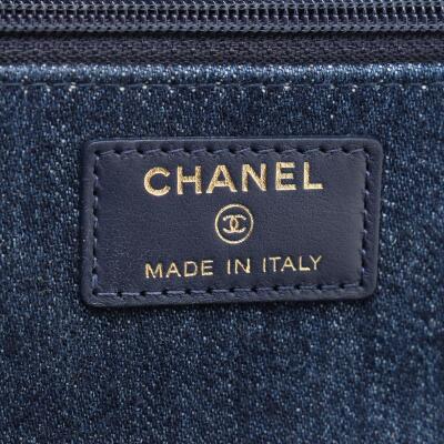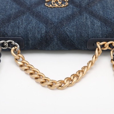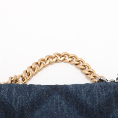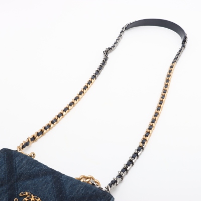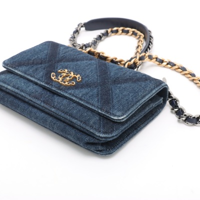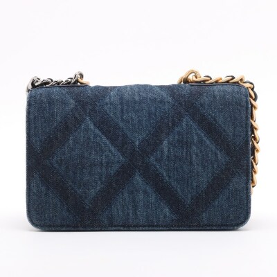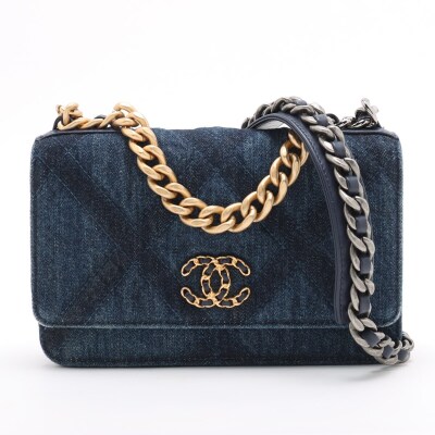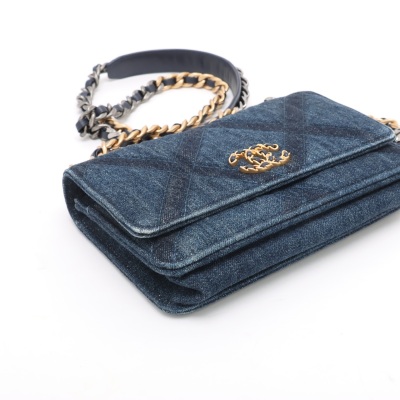 Chanel 19 Wallet on Chain in dark blue denim (#NUXXXXXX, circa: after 2021). Featuring gold and silver-toned hardware, chain link handle, and a chain-link strap with leather shoulder pad. The CC 19 logo on flap with magnetic button closure opens to a black textile lined interior with a zippered pocket, patch pockets and card slots. Approximate dimensions: 19cm(W) x 13cm(H) x 4cm(D), 7cm chain handle drop and 64cm strap drop. Accompanied by a Chanel dustbag and box. With Entrupy Certificate of Authenticity.