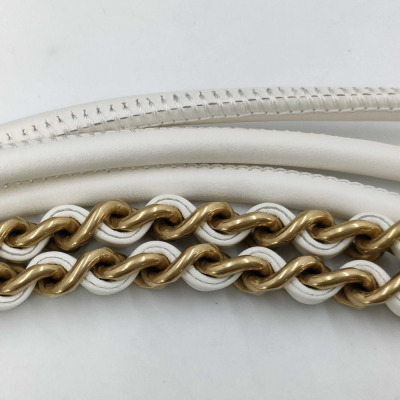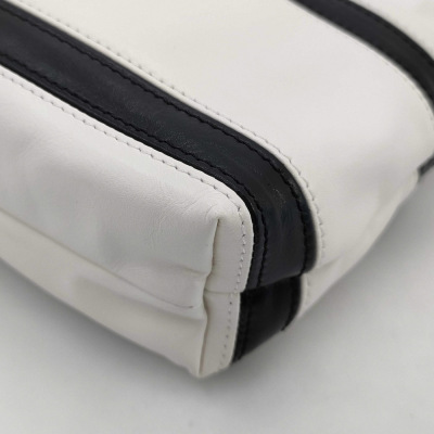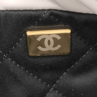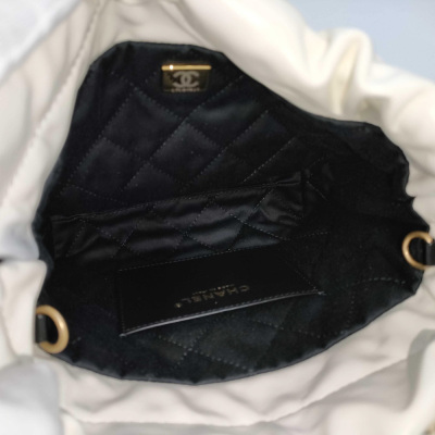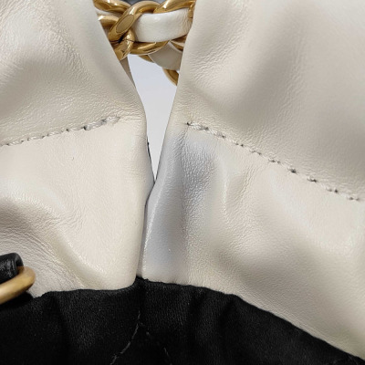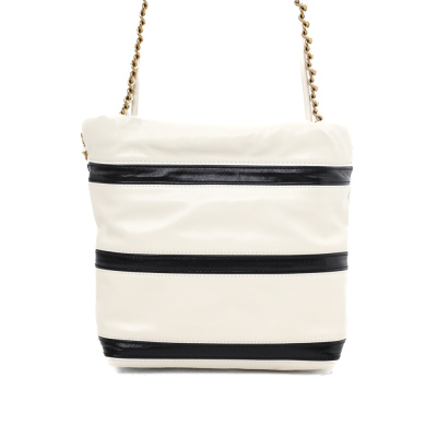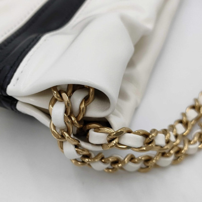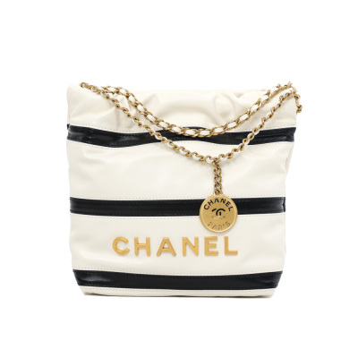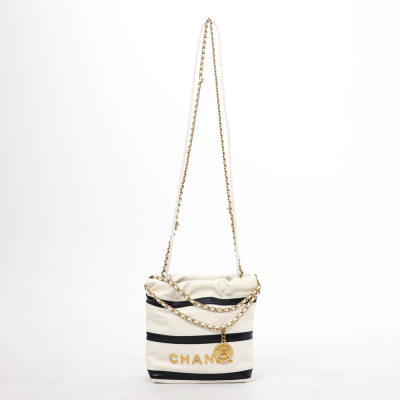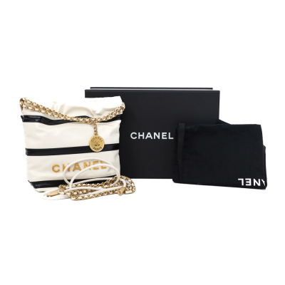 Chanel 22 mini Hobo in striped black & white calfskin leather (#L7XXXXXX). Featuring antique gold-toned hardware, leather threaded chain link handles with logo plate, a detachable leather threaded chain & leather cord strap, and CHANEL hardware logo on the front. The handles cinch open to a black nylon lined interior with a leather card slot. Approximate dimensions: 17cm(W) x 20cm(H) x 6cm(D), with a 10cm handle drop and 45cm strap drop. Accompanied by a Chanel dustbag and box. With Entrupy Certificate of Authenticity.