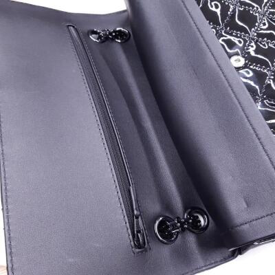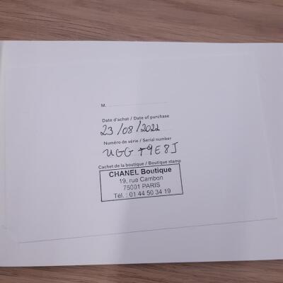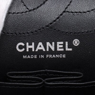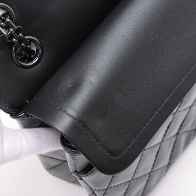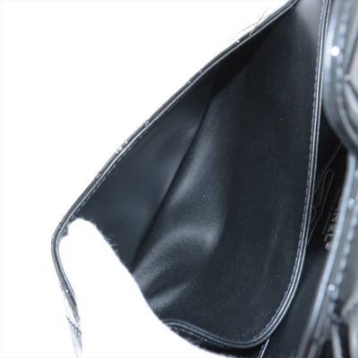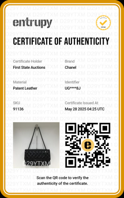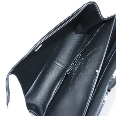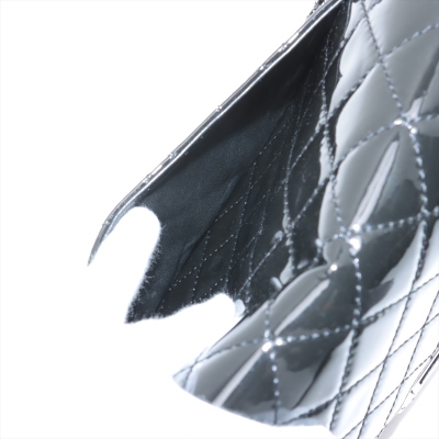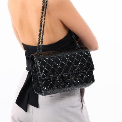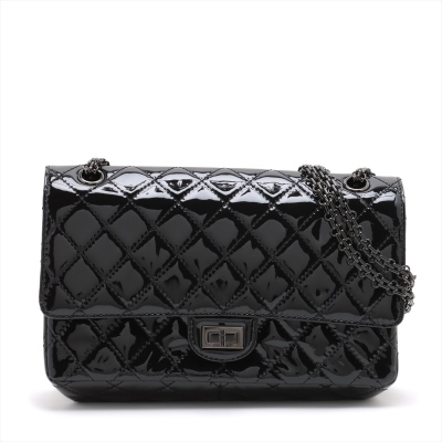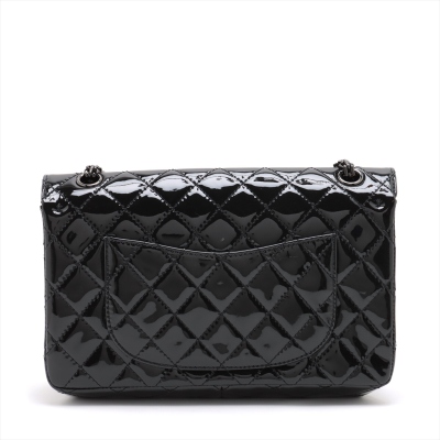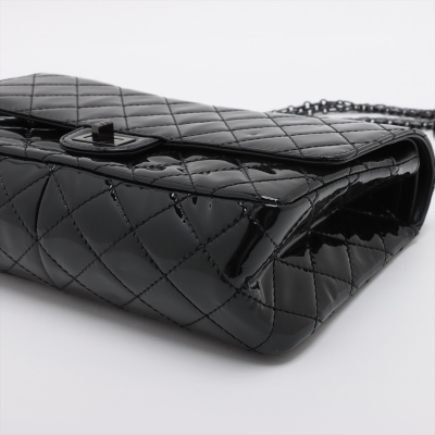 Chanel 2.55 Large Double Flap bag in black patent leather (#UGxxxxxx). Featuring black-toned hardware, exterior rear patch pocket, and sliding chain strap. The turn-lock on front flap opens to the inner flap, flat pocket and black leather interior with patch pockets. Approximate dimensions: 27.5cm(L) x 19cm(H) x 9cm(D), double strap drop: 28cm. Accompanied by Chanel booklet dated 23/08/2022, dustbag and box. With Entrupy Certificate of Authenticity. (Pre-owned)