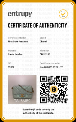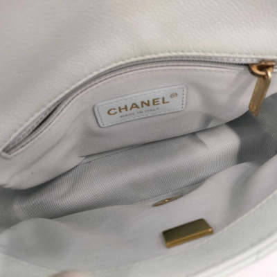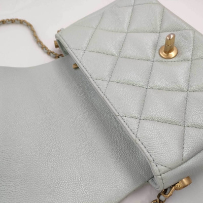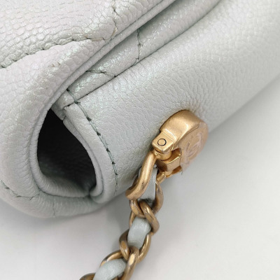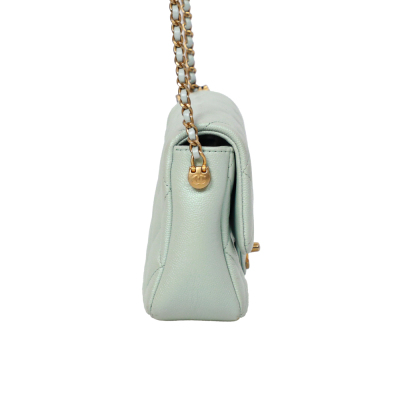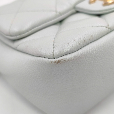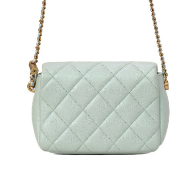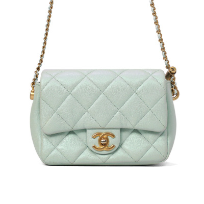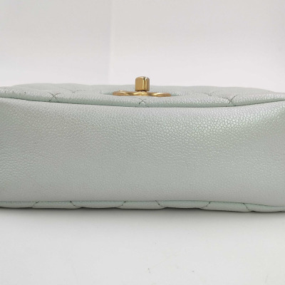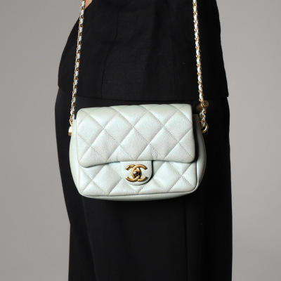 Chanel mini square flap bag in iridescent minty green caviar skin leather (#Cxxxxxxx, circa: after 2021). Featuring aged gold-toned hardware and classic chain leather strap with a cord toggle. The CC turn-lock closure on flap opens to a tonal canvas interior with a zippered pocket. Approximate dimensions: 19cm(Base-L) x 13cm(H) x 7cm(D), with an adjustable 58cm chain drop. With Entrupy Certificate of Authenticity.