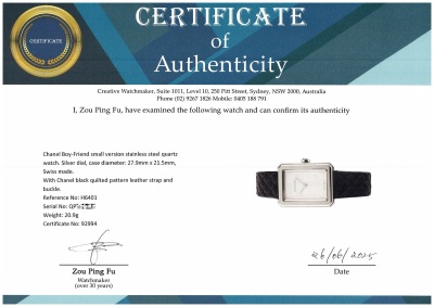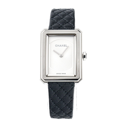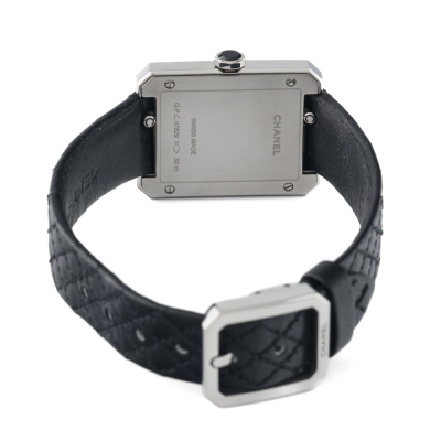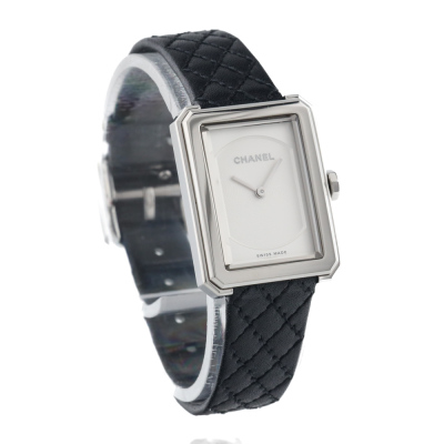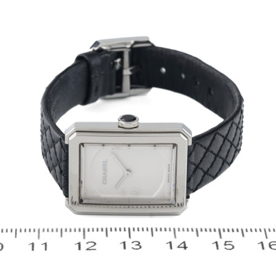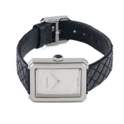 Chanel Boy-Friend small version stainless steel quartz ladies watch. Silver dial, case diameter: 27.9mm x 21.5mm, strap length: 17cm, Swiss made. Ref# H6401. With Chanel black quilted pattern leather strap and buckle. With Certificate of Authenticity, Chanel International warranty card dated 17/02/2024, spare Chanel black leather strap and Chanel box. Balance of 5 year Chanel manufacturer warranty applies. Weight: 20.9g (Pre-owned)