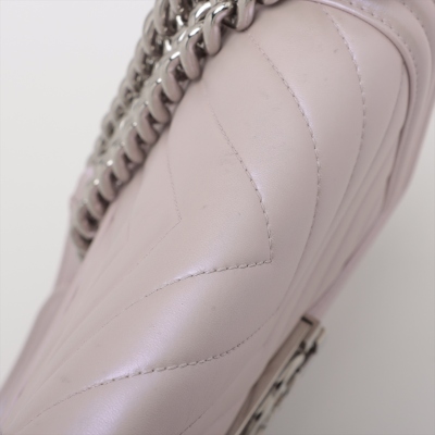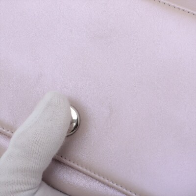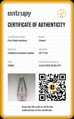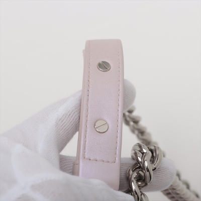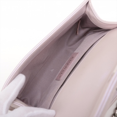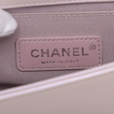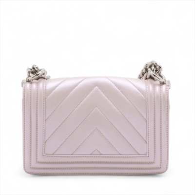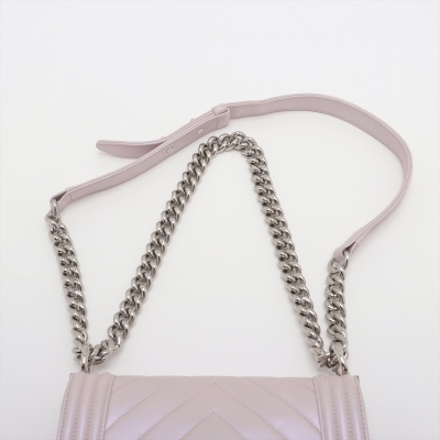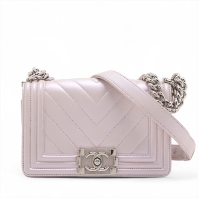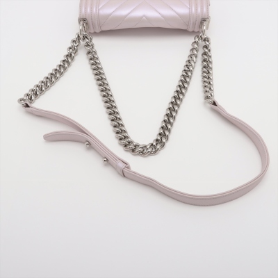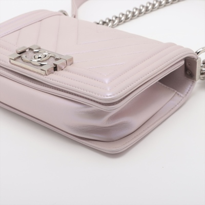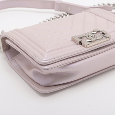 Chanel small boy flap bag in chevron quilted light purple with metallic effect lambskin with a linear quilted border (#25xxxxxx). Featuring shiny silver-toned hardware, frontal flap with Chanel boy logo press-lock closure. It opens to a light pink fabric lining interior with a patch pocket. Approximate dimensions: 20cm(L) x 12cm(H) x 5.5cm(D), 55cm shoulder chain link strap drop. With Entrupy Certificate of Authenticity. (Pre-owned)