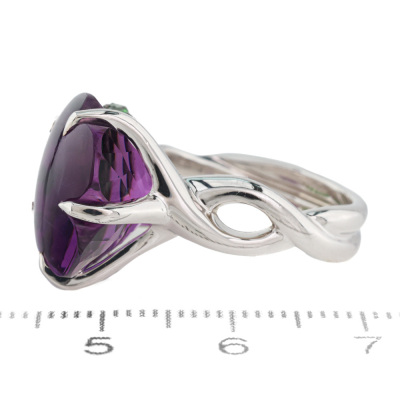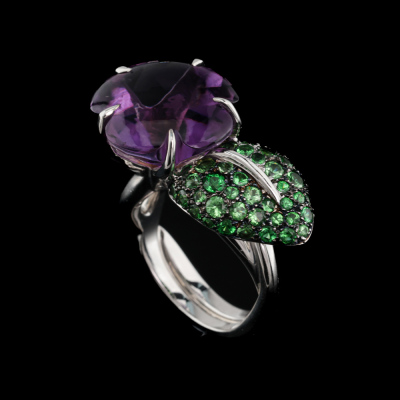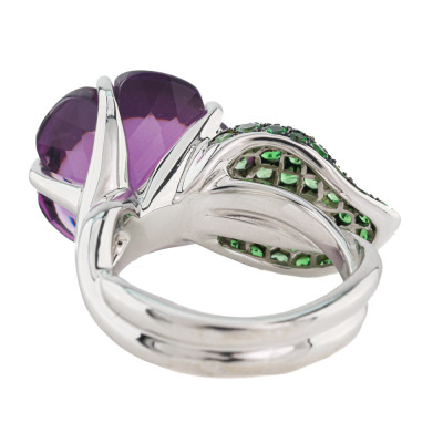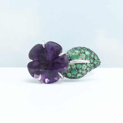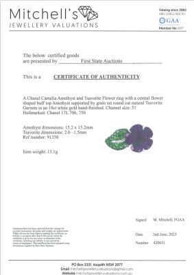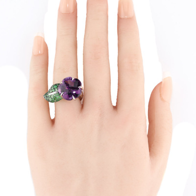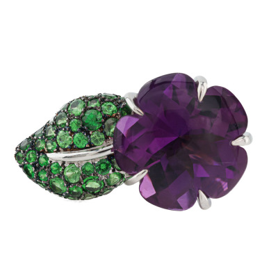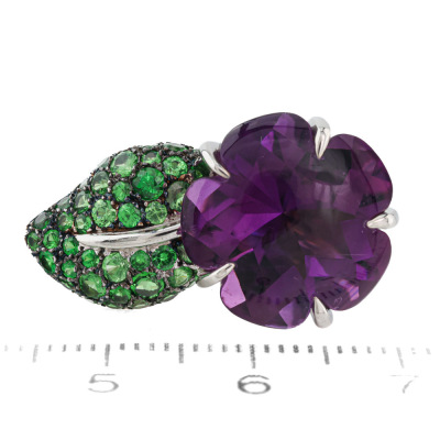 Chanel Camellia Amethyst and Tsavorite Flower ring with flower shape buff top Amethyst of size approximately 15.2 x 15.2mm and round Natural Tsavorite Garnes of size approximately from 2mm - 1.5mm. 18ct white gold. Channel size 51, actual ring size K1/4 - ring resizing is not recommended. Band width: 4.4mm - 4.6mm. Weight: 13.1g. With Certificate #420631. (Pre-owned)