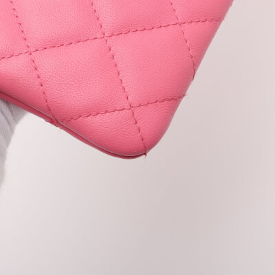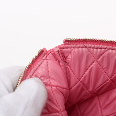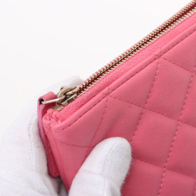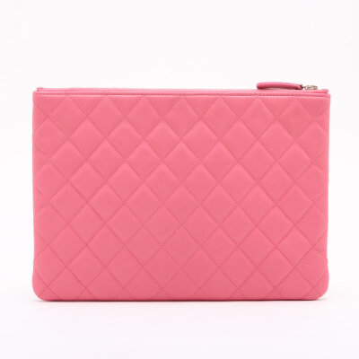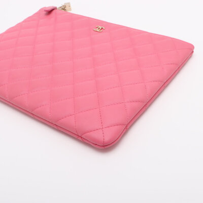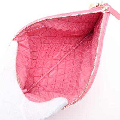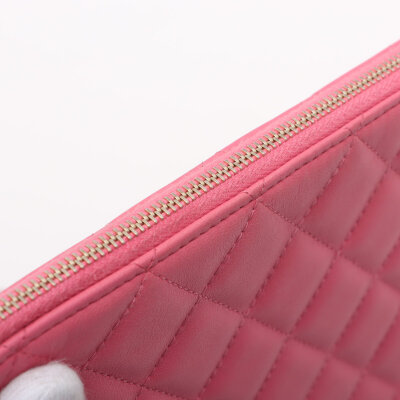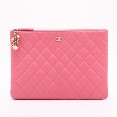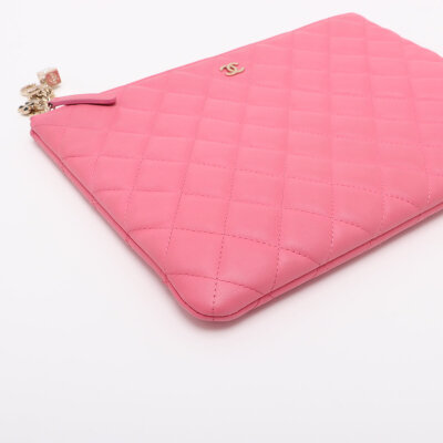 Chanel Casino O Case clutch in pink diamond quilted lambskin leather (#22XXXXXX, circa: 2016). Featuring light gold-toned hardware. The top zipper with decorative charms opens to a pink nylon interior. Approximate dimensions: 27cm(W) x 20cm(H). With Entrupy Certificate of Authenticity.