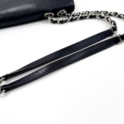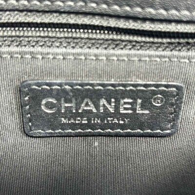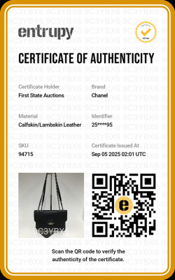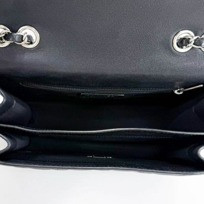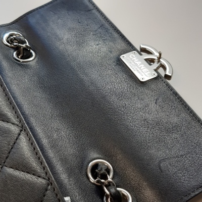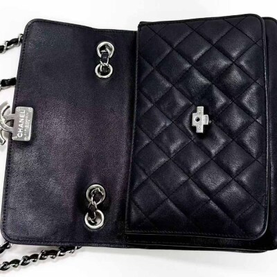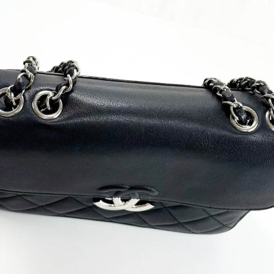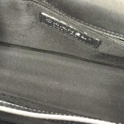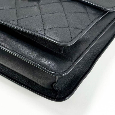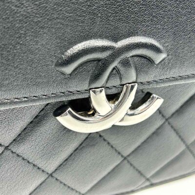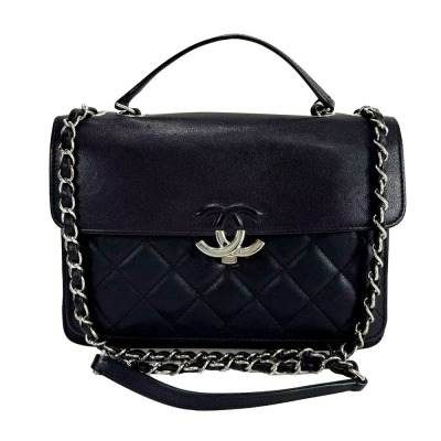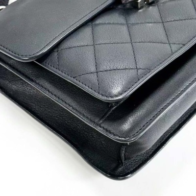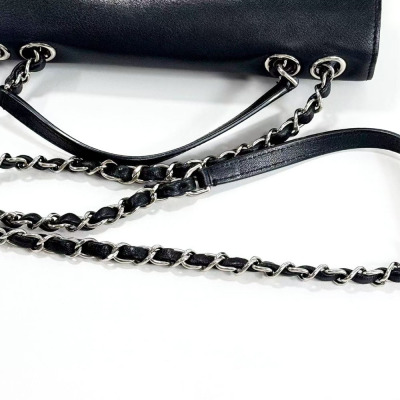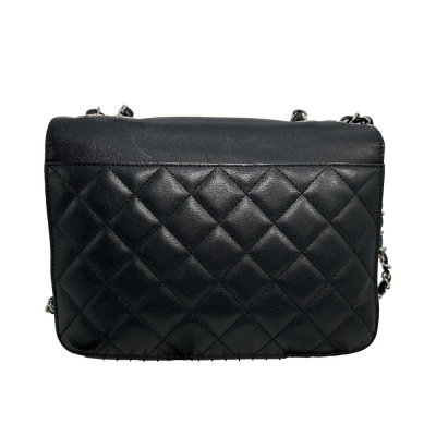 Chanel CC Box flap bag in black calfskin leather (#25xxxxxx). Featuring diamond-quilted body, and smooth flap, silver-toned hardware, leather-chain shoulder strap, and CC logo at front. The push-lock closure opens to a black textile interior with two compartments with a zip pocket. Approximate dimensions: 23cm(L) x 16cm(H) x 6cm(D), sliding chain-link shoulder strap drop 47cm. With Entrupy Certificate of Authenticity. (Pre-owned)