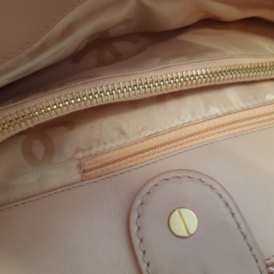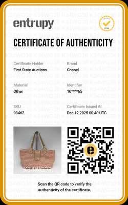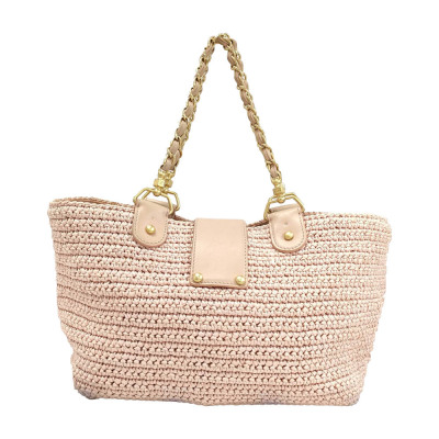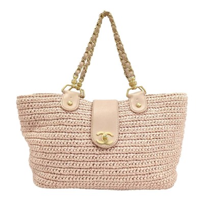 Chanel CC straw tote bag in pink woven raffia and with leather trims (#10xxxxxx: 2005-2006). Featuring matt gold-toned hardware, dual leather-chain woven shoulder straps and a fold over leather strap with classic CC turn-lock closure. This opens to a pink logo printed nylon lining 2 compartment divided by a centre zipper pocket. Approx. dimensions: 37cm(Top-L) x 21cm(H) x 14cm(D) and 20cm shoulder strap drop. With Entrupy Certificate of Authenticity. (Pre-owned)