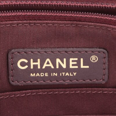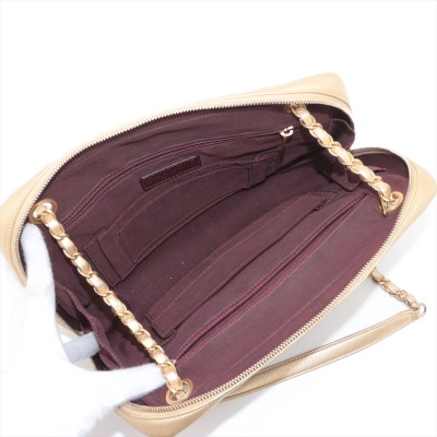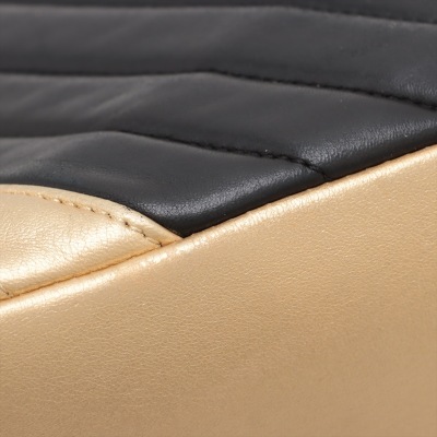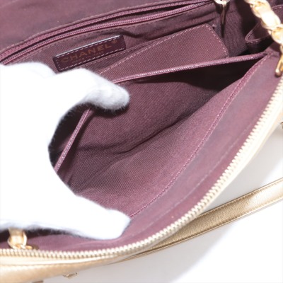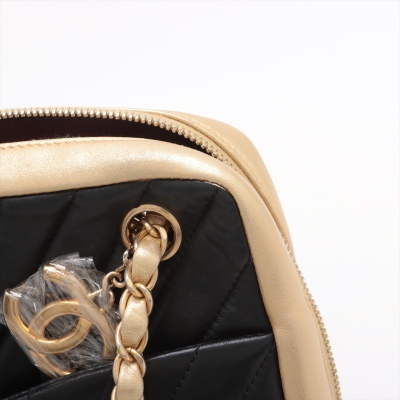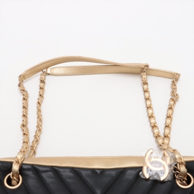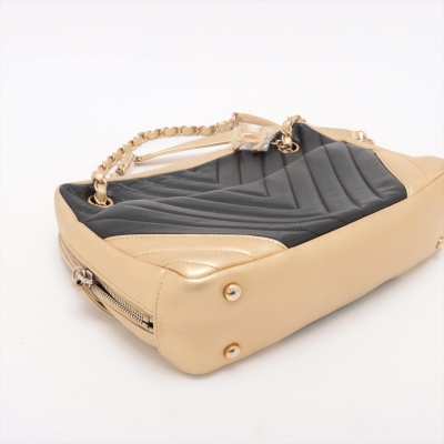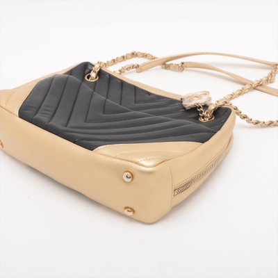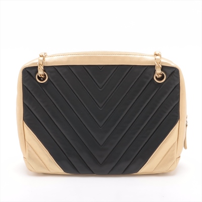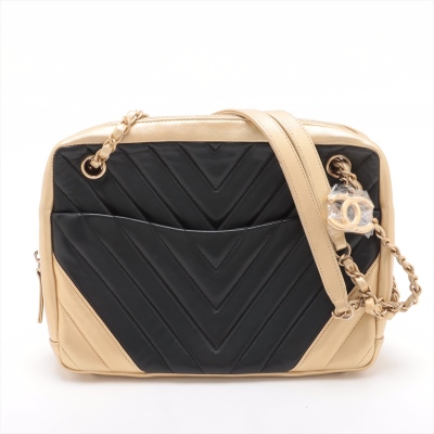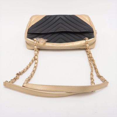 Chanel camera shoulder bag in black & gold chevron quilted lambskin leather (#20xxxxxx: 2014-2015). Featuring antique gold-toned hardware, an exterior slip pocket at front & leather-chain woven shoulder straps with interlocking CC logo charm. The top zip opens to a maroon fabric-lined interior with 2 zip pockets, patch pockets & a slip pocket with snap button closure. Approx. dimensions: 25cm(L) x 19cm(H) x 7cm(D) & 30cm doubled shoulder strap drop. With Entrupy Certificate of Authenticity.(Pre-owned).