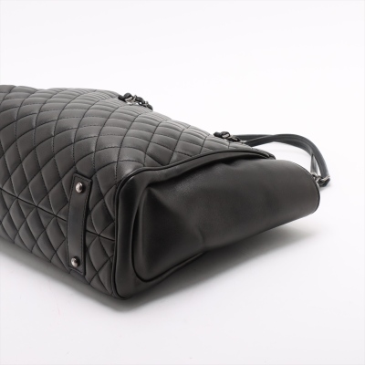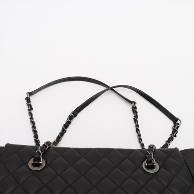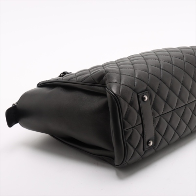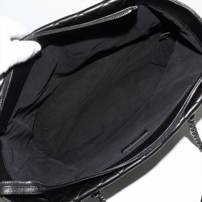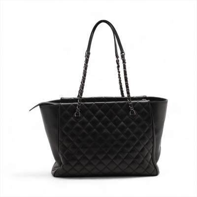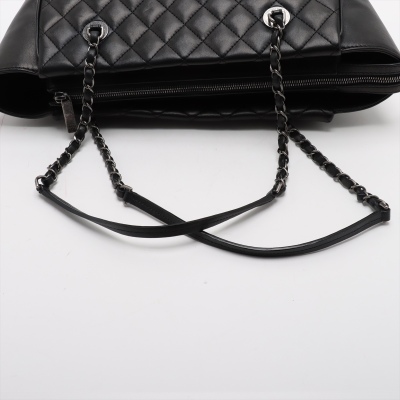 Chanel Coco Charm shopping tote bag in black diamond quilted lambskin leather and smooth leather on sides (#23xxxxxx: 2016-2017). Featuring antique silver-toned hardware, dual leather-chain woven shoulder straps, and a interlocking CC charm at front. The top zipper opens to a black textile-lined spacious compartment with a zip pocket. Approximate dimensions: 32cm(Base-L) x 25.5cm(H) x 12cm(D), and 25.5cm shoulder drop. With Entrupy Certificate of Authenticity. (Pre-owned).