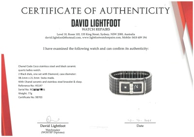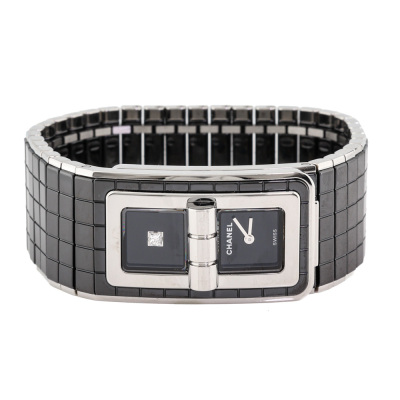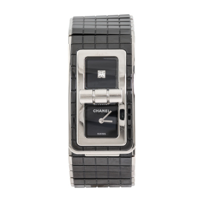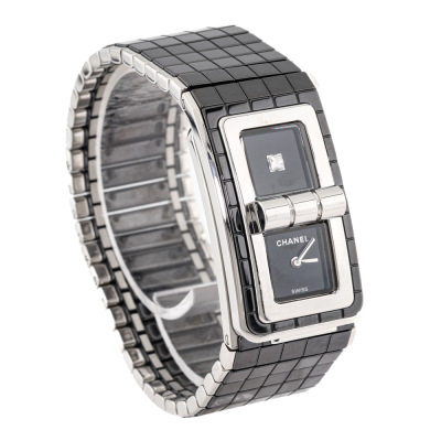Chanel Code Coco stainless steel and black ceramic quartz ladies watch. 2 Black dials, one set with Diamond, case diameter: 38.1mm x 21.5mm, wrist size: 15.5cm, Swiss made. Ref# H5147. With Chanel black ceramic and stainless steel bracelet and clasp. With Certificate of Authenticity and Chanel case. 3 month FSA warranty. Weight: 77g