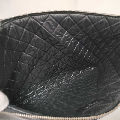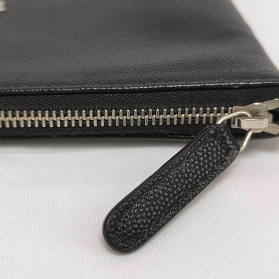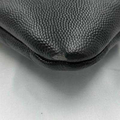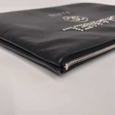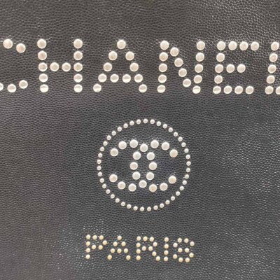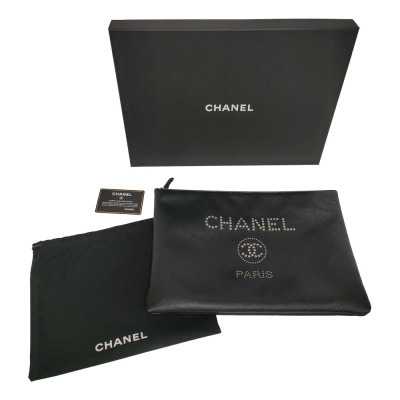 Chanel Deauville clutch in black caviar leather (#25xxxxxx). Featuring aged silver & gold studs at front, silver toned hardware and a zip closure. The top opens to a black nylon interior. Approximate dimensions: 34cm (L) x 24cm(H) x 2cm(D). Accompanied by Chanel certificate, info booklet, dust bag and box. With Entrupy Certificate of Authenticity. (Pre-owned)