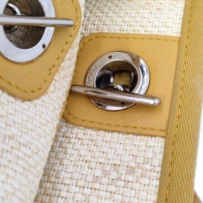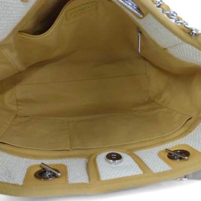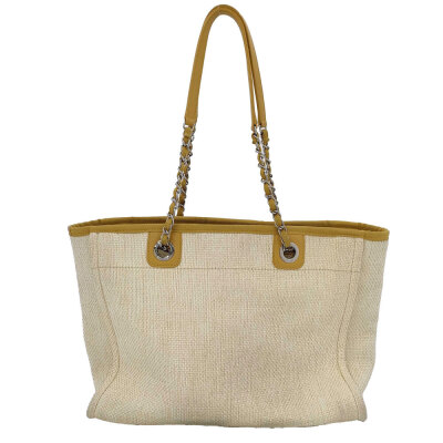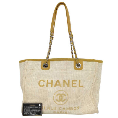 Chanel Deauville tote bag in light yellow in fine raffia straw and yellow Rue Cambon address print (#21xxxxxx). Featuring silver-toned hardware, yellow leather threaded chain shoulder straps. The top opens to yellow textile main compartment with patch and zip pockets. Approx dimensions: 33cm(L) x 25cm(H) x 10cm(D), strap drop 32cm. Accompanied by Chanel certificate card. With Entrupy Certificate of Authenticity. (Pre-owned)