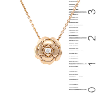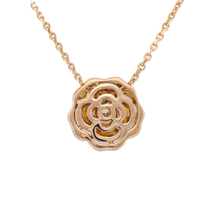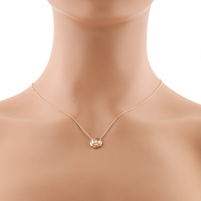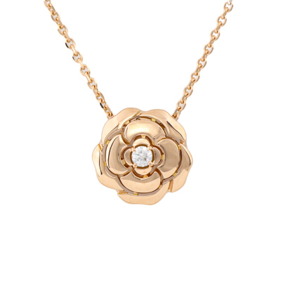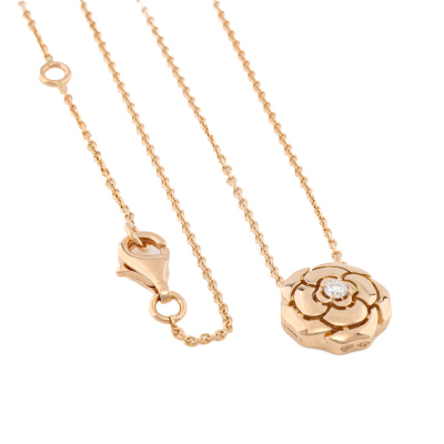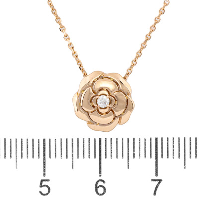 Chanel Extrait De Camelia necklace with centre round Natural Diamond of 0.04ct. 18ct rose gold with 39cm - 42cm - 45cm - 47.5cm 18ct rose gold chain. Weight: 4.2g. With Chanel Box.
