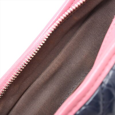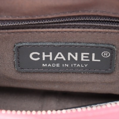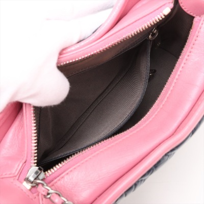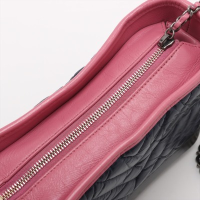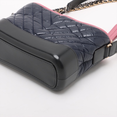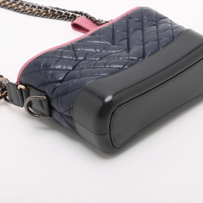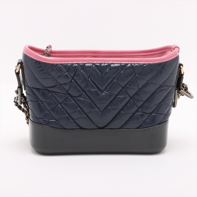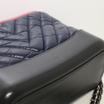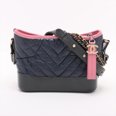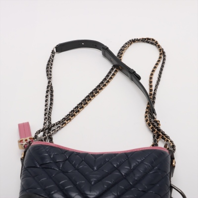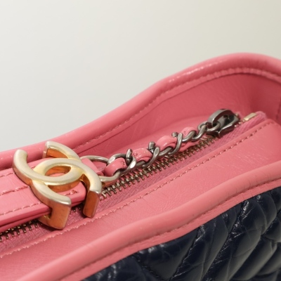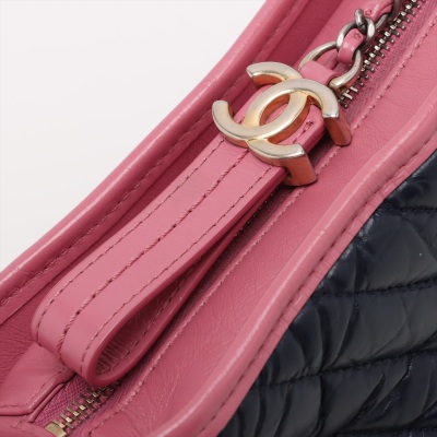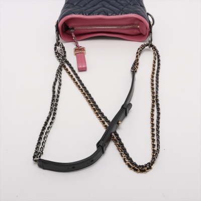 Chanel small Gabrielle hobo bag in navy blue chevron quilted aged calfskin with top pink leather trim and black smooth leather base (#26XXXXXX, circa:2018-19 ). Featuring multi-toned hardware, and a removable sliding chain-link threaded shoulder strap. The zip top opens to a textile interior with a patch and zippered pocket. Approximate dimensions: 20.5cm(base-W) x 16cm(H) x 8cm(D), with a 75cm adjustable strap. With Entrupy Certificate of Authenticity.