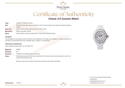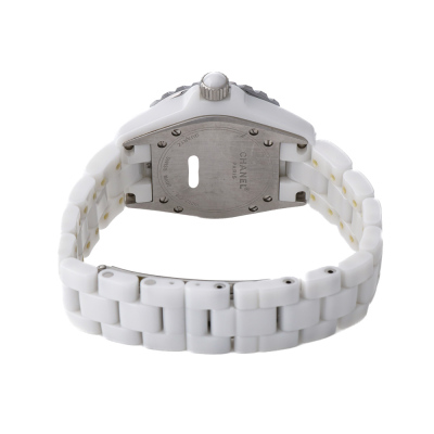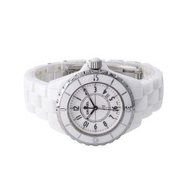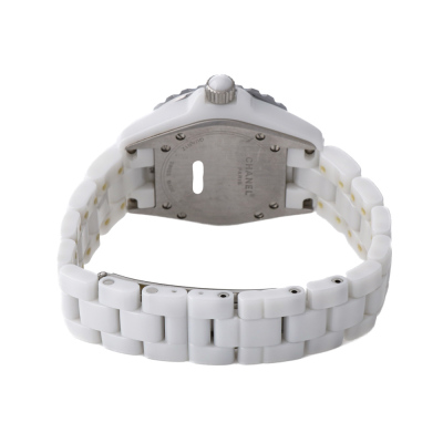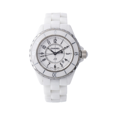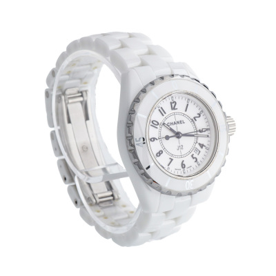 Chanel J12 ceramic and stainless steel quartz ladies watch. White dial, date, case diameter: 33mm, wrist size: 16cm, Swiss made. Ref# H0968. With Chanel white ceramic bracelet and clasp. With Certificate of Authenticity. 3 month FSA warranty. Weight: 102.9g.
