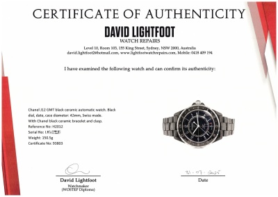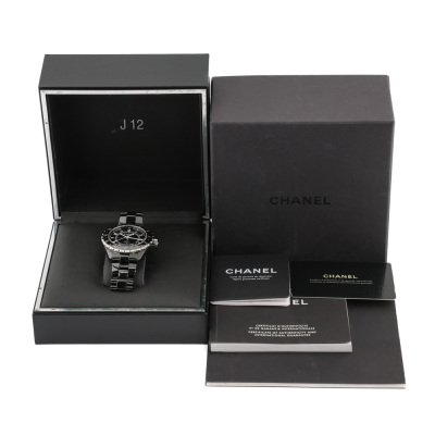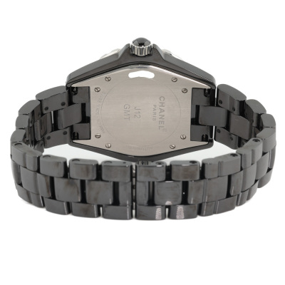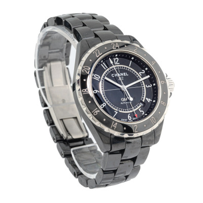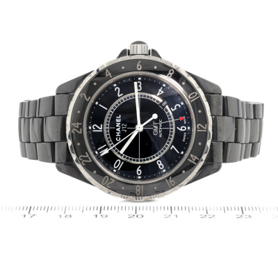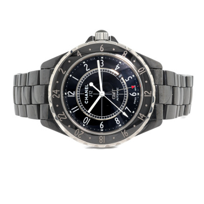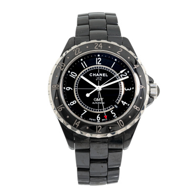 Chanel J12 GMT black ceramic automatic mens watch. Black dial, date, case diameter: 42mm, wrist size 20cm, Swiss made. Ref# H2012. With Chanel black ceramic bracelet and clasp. With Certificate of Authenticity, Chanel undated International warranty card, Chanel Repair Guarantee Certificate booklet dated 18/08/2017 and Chanel box. 3 month FSA warranty. (Pre-owned)