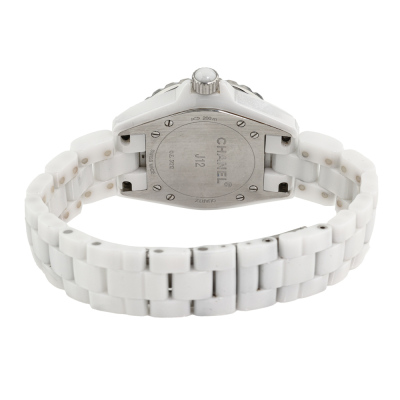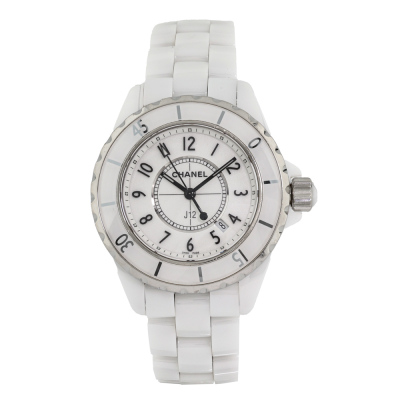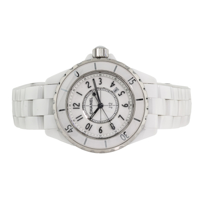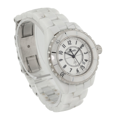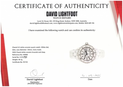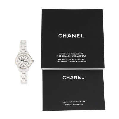 Chanel J12 white ceramic quartz ladies watch. White dial, date, case diameter: 33mm, wrist size: 17.5cm, Swiss made. Ref# H0968. With Chanel white ceramic bracelet and clasp. With Certificate of Authenticity, Chanel International Guarantee card dated 18/10/2012 and Chanel box. 3 month FSA warranty. Weight: 99.7g (Pre-owned)