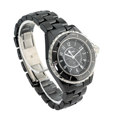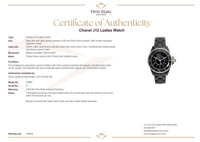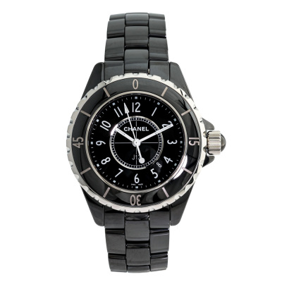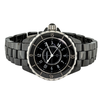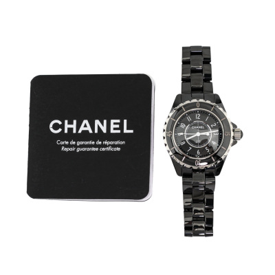 Chanel J12 black ceramic and stainless steel quartz watch. Black dial, date, case diameter: 33mm, wrist size: 17.5cm, Swiss made. Ref# H0682. With Chanel black ceramic bracelet and clasp. With Certificate of Authenticity, Chanel Repair Guarantee Certificate booklet dated 29/03/2024 and Chanel box. 3 month FSA warranty. Weight: 100.1g